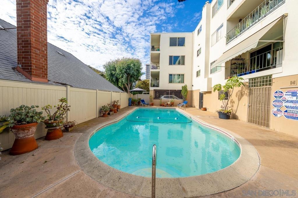 Move-in ready, top floor unit with stunning city views in coveted Bankers Hill! This spacious 2 bed 2 bath floorplan includes expansive windows, combined living & dining room, large galley style kitchen with rich cherry wood cabinetry & unique quartz counters, West-facing view balcony, neutral color palette, plantation shutters in living room, central air & heat and reserved parking! Secure, well-maintained building with pool & recent updates to landscaping. Friendly condo community. Prime location near Balboa Park, shopping, dining, nightlife and downtown San Diego! Close to airport & beaches!