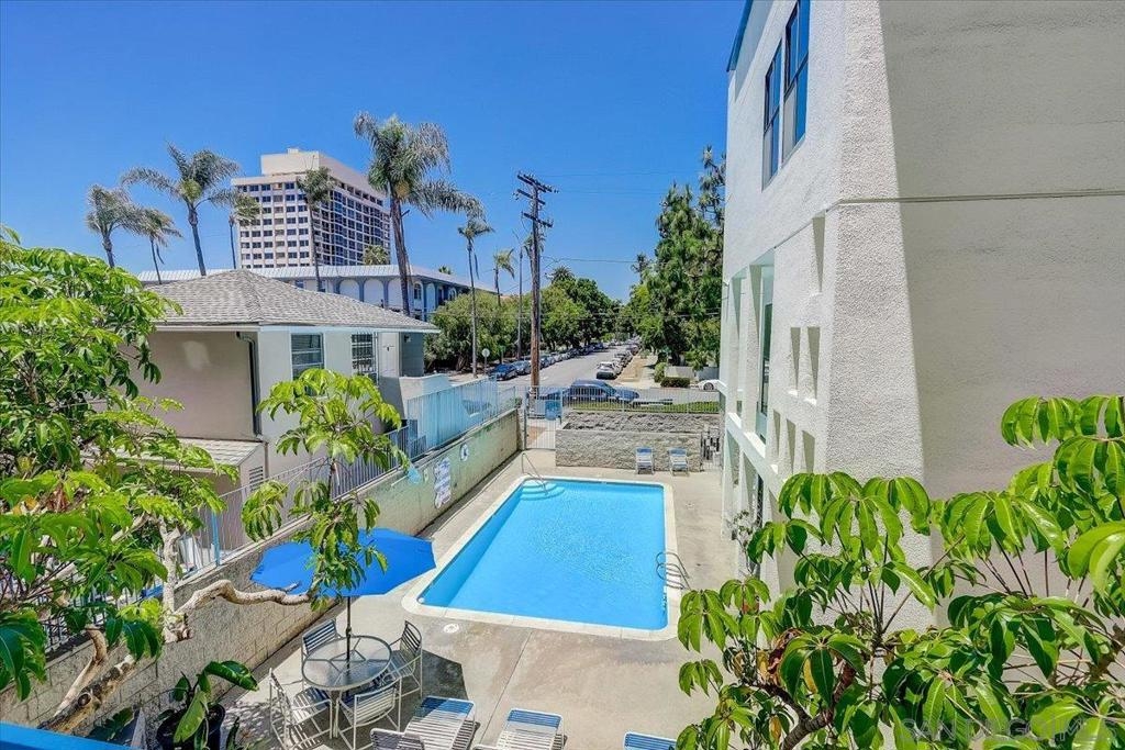 Beautifully maintained condo unit located within the highly desirable gated community of Le Parc Chateau in Hillcrest. This stunning property boasts a large open floor plan with fresh paint, a cozy fireplace, in-unit laundry, and durable flooring throughout the main living areas. A beautifully updated kitchen featuring quartz countertops with a Subway tile backsplash, stainless steel appliances, recessed and pendant lighting, and crisp white cabinetry with breakfast counter seating that opens to the living area. A large primary suite with its own en-suite bathroom offering dual sinks, a walk-in shower, and dual closets. This unit is located in the most prime area of the complex with the largest balcony in the complex that overlooks the pool. Parking is a breeze with two assigned parking spots in the secure underground garage. Unsurpassed community amenities include a sparkling pool and spa, and recreation room. Centrally located in the heart of Hillcrest and only minutes away from Mission Valley, The San Diego Zoo, Balboa Park, shopping, dining, Interstates 163, 8 and the 5, plus so much more. Don’t let this opportunity pass you by! Complex Features: ,,,, Equipment: Dryer,Fire Sprinklers,Garage Door Opener,Pool/Spa/Equipment, Washer Sewer: Sewer Connected Topography: LL