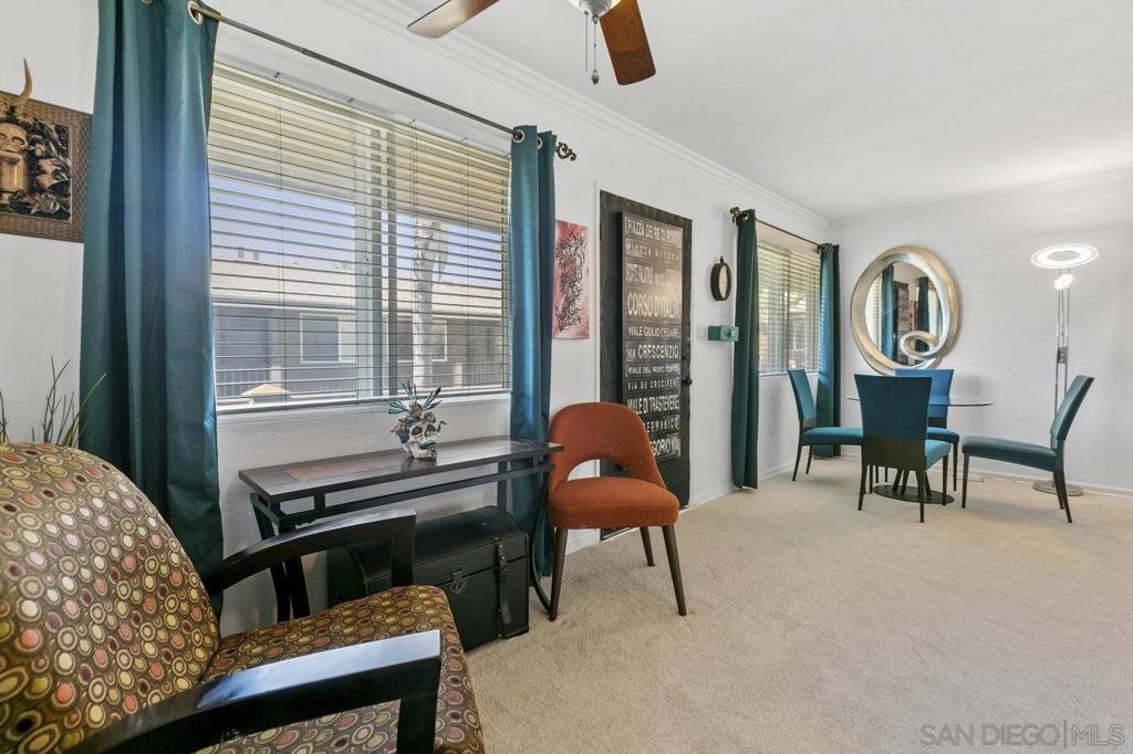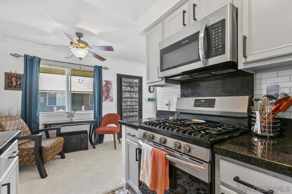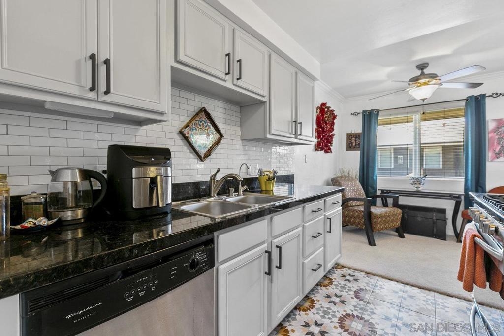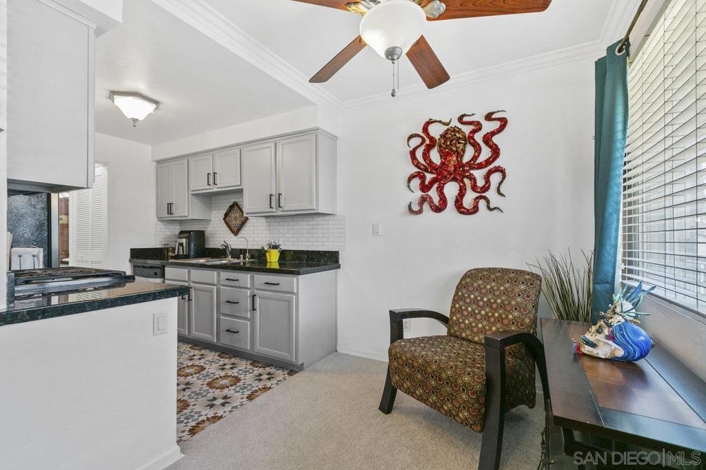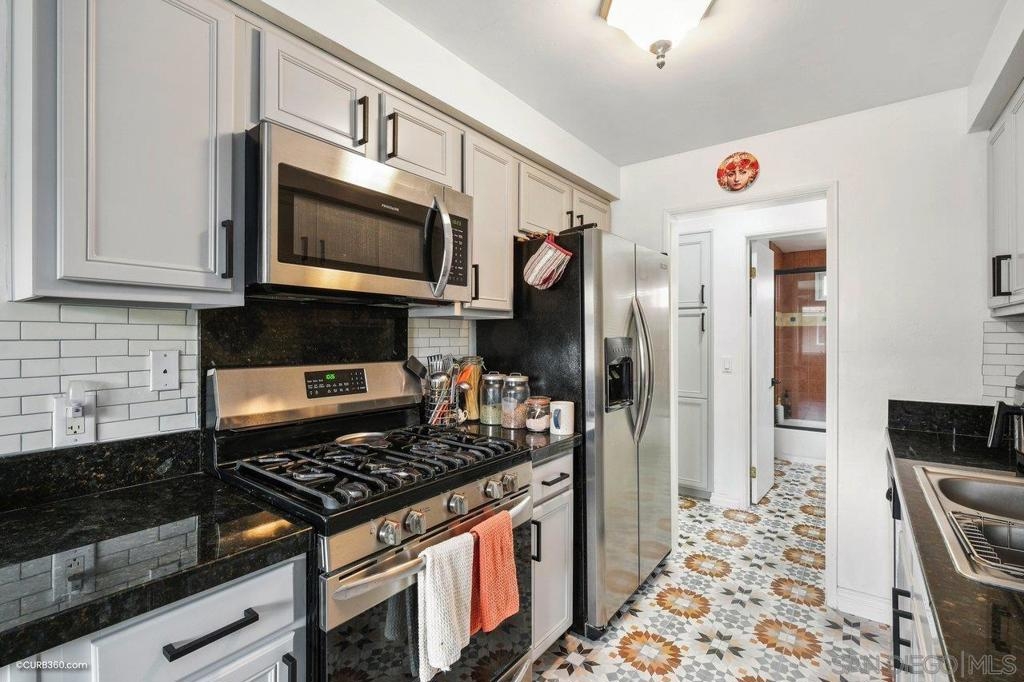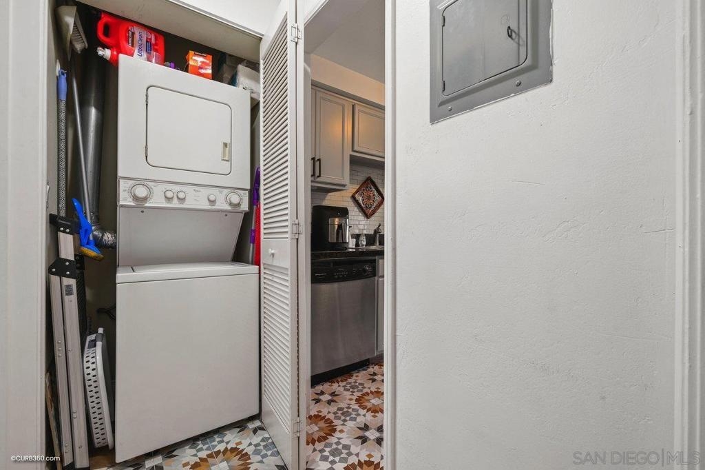 This stunning top floor condo situated in the desirable gated community of Stone Gate is nestled in the heart of Hillcrest. Offering spacious living room and bedroom with ample storage, and a convenient stackable washer and dryer. Brand new carpet throughout. The kitchen and bathroom feature striking designer Moroccan tile flooring and freshly painted cabinets. The kitchen offers stainless steel appliances, a newly installed reverse osmosis unit and garbage disposal in the sink. The bathroom has been updated with brand new toilet and sink. Triple-pane windows offer natural light and energy efficiency. You'll have an assigned parking space, and Stone Gate provides a well-manicured courtyard featuring a 3-Tier Waterfall Fountain, seating, and BBQ area. Perfectly situated within walking distance to Whole Foods, Ralphs, Trader Joes, Better Buzz Coffee, cafes, restaurants, and more.