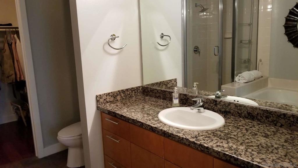 BOMK w/ new price! Luxurious 5th floor home at The Egyptian in Hillcrest! $40k in upgrades. Beautiful Brazilian walnut hardwood floors & custom lighting throughout. The kitchen features a large island with Baltic brown granite countertops, stainless steel Samsung & GE appliances & maple cabinetry. Spacious master suite with walk-in closet, separate tub & shower with ceramic tile floors. This 1130 sq ft home also offers a second full bath & a bonus den that can be used for an office or? Huge view patio! Equipment: Fire Sprinklers Other Fees: 0 Sewer: Public Sewer Topography: LL