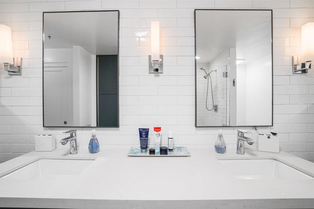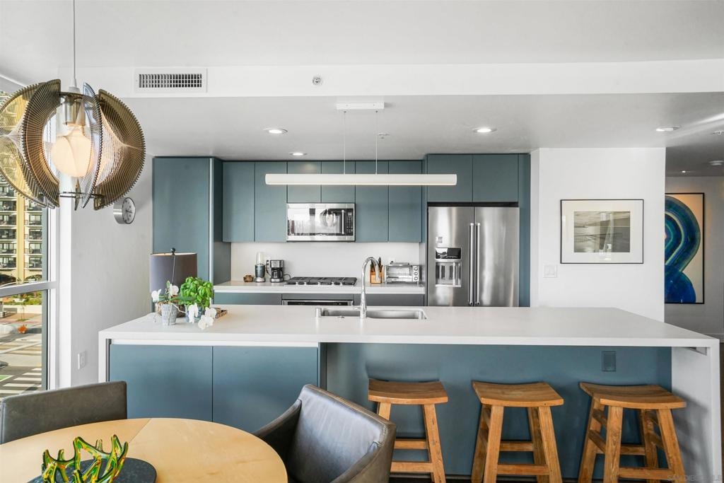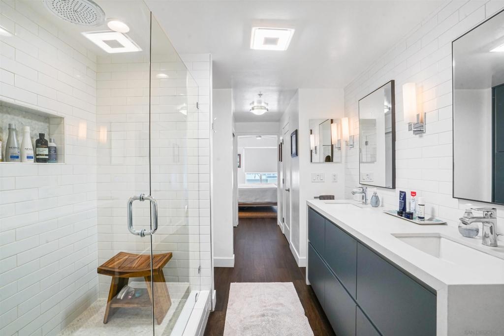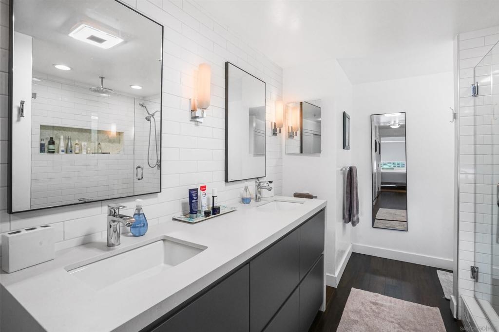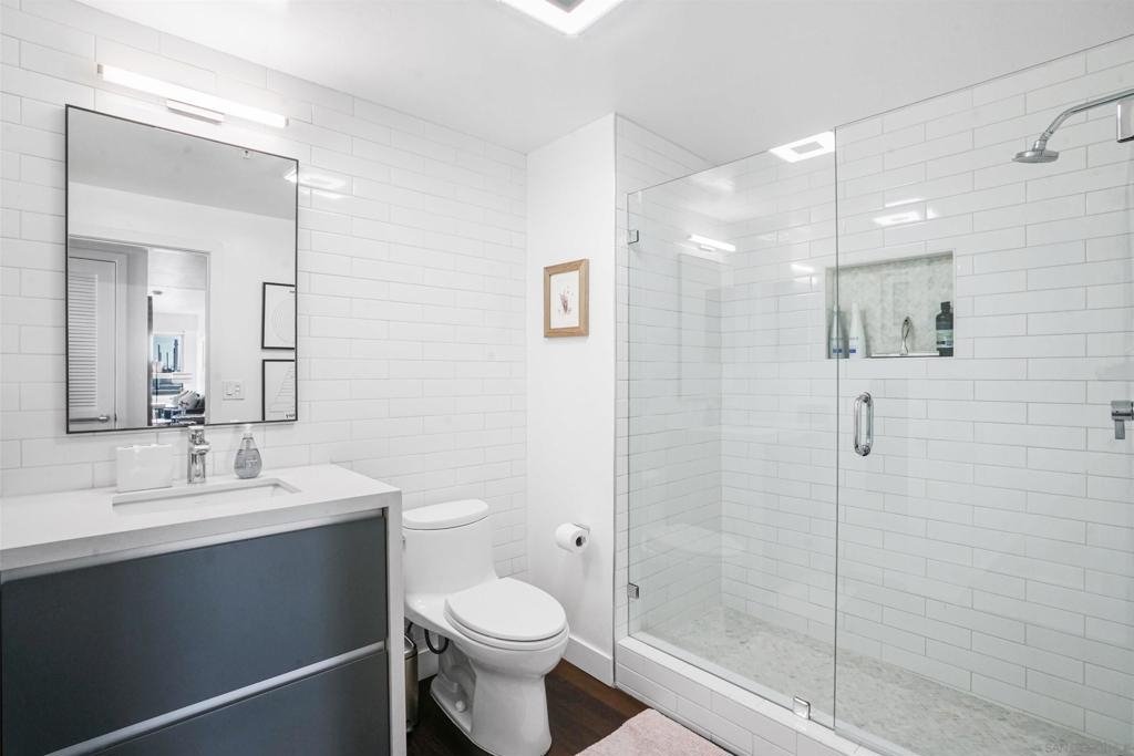 Stunning, recent remodel in the iconic Egyptian building! This reimagined corner unit offers panoramic northwest views toward Mt. Soledad, designer finishes, and a rare private patio. The interior showcases luxury vinyl tile throughout, Pedini cabinetry, KitchenAid appliances, a wine fridge, custom closets, and spa-inspired bathrooms. Additional highlights include Google Fiber readiness, 2 parking spaces with an EV charger, a large storage unit, and unbeatable walkable access to Hillcrest, Balboa Park, and more! Located in the heart of Hillcrest, this fully upgraded residence combines sophisticated design with everyday functionality. The sleek kitchen boasts Italian Pedini cabinets, a large waterfall island, pull-out pantry, Ferguson fixtures, and tucked outlets—all complemented by premium KitchenAid appliances and a built-in wine fridge. Floor-to-ceiling windows flood the open-concept living space with light and connect to a spacious private patio with elevated city views. The bathrooms are bright and serene, featuring white subway tile, upgraded lighting, Bluetooth speakers, and recessed niches. Additional upgrades include solid-core interior doors, Preston custom closets, under-cabinet lighting, dimmable recessed lights, a new laundry machine, and fully redone electrical throughout. Enjoy high-speed Google Fiber readiness, a private storage unit, and two garage parking spaces with an EV charger. Ideally situated near University Ave. and Park Blvd., you're steps from Hillcrest Farmers Market, the San Diego Zoo, Balboa Park, and endless dining options. With easy access to North Park, University Heights, Downtown, and the airport—this location truly connects you to it all.