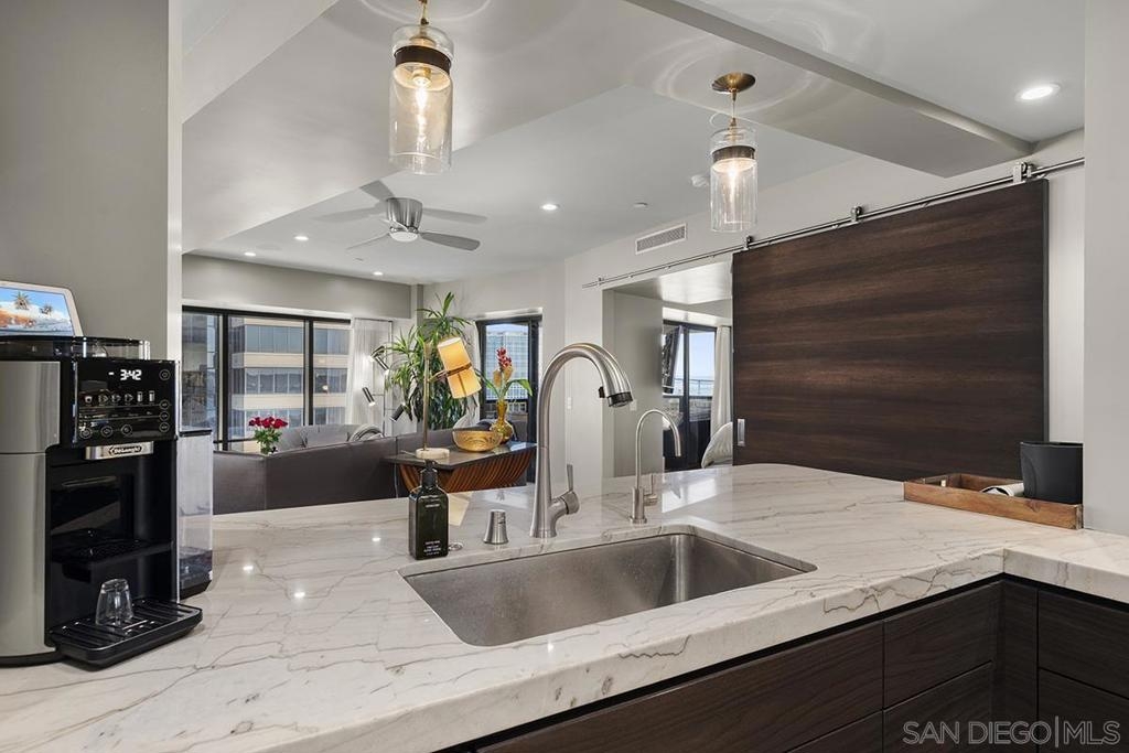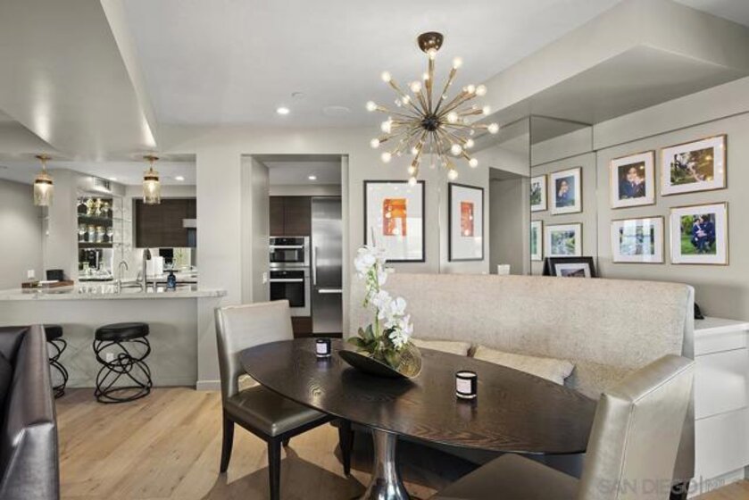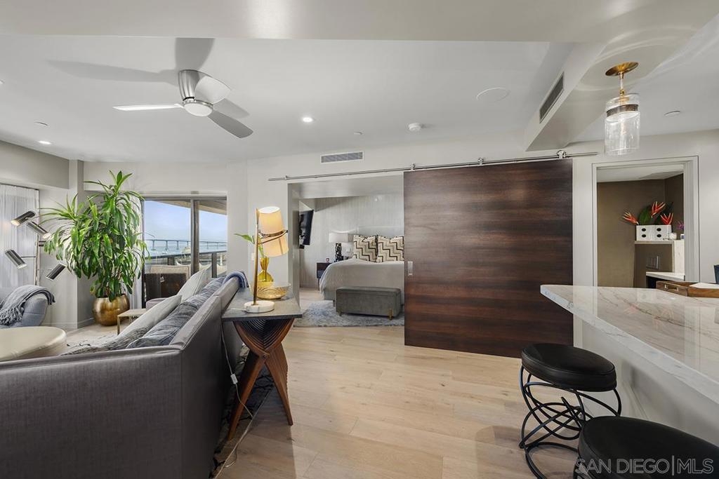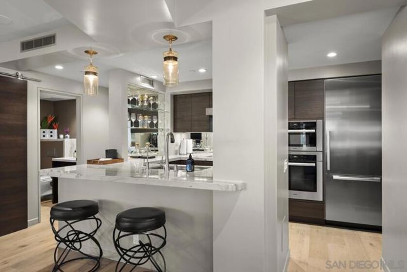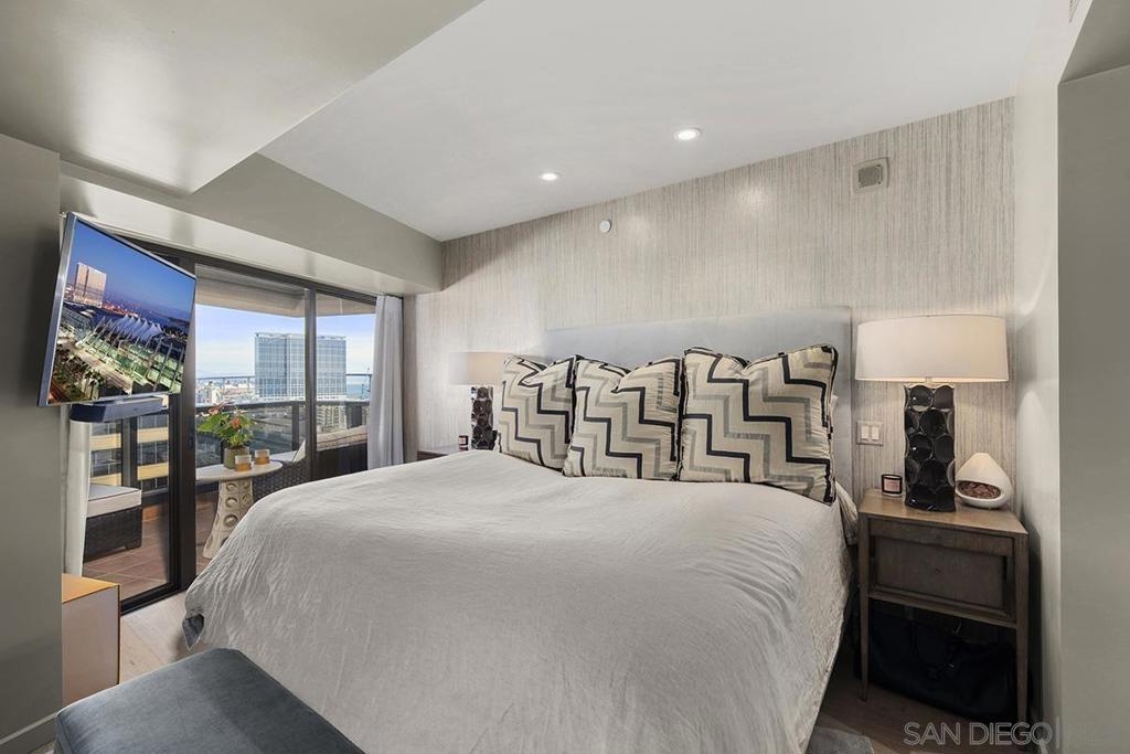 This is the finest 1-bedroom "re-imagined" condo ever seen in the Harbor Club; fully remodeled practically down to the studs! This beautifully curated residence offers a rare blend of luxury, privacy, and prime Marina District living plus one of the few with 1.5 bathrooms to boot. Positioned high enough to rise above neighboring buildings, the home captures sweeping views of the San Diego Bay and the iconic Coronado Bridge through walls of windows flooding the residence with natural light. The professionally decorated interior shows a sleek, modern kitchen appointed with high-end appliances, European-style cabinetry, mirrored backsplash, slab porcelain island, beverage chiller, and an eat-at bar accented by elegant drop lighting making it perfect for both everyday living and entertaining. The primary suite is a serene retreat featuring balcony access, a custom wall treatment, a new built-in closet, and a spa-inspired ensuite bathroom with dual vanity and a step-in rain shower with an additional handheld shower head. Rare for a one-bedroom residence, this home also offers a separate powder room, adding both convenience and sophistication for guests. Additional highlights include a French Oak hardwood flooring, Smart-controlled lighting, built-in sound system throughout, and a secure parking space with EV charger. This is truly a standout opportunity in the heart of the Marina District and luxury urban living at its finest. Residents of the Harbor Club are treated to an array of lavish, resort-inspired amenities that encompass a round-the-clock front desk service, a state-of-the-art gymnasium, an exquisite pool deck, a sociable club room, and a versatile library/business center, among numerous other perks. Nestled in the much-coveted Marina District, the Harbor Club boasts unparalleled ease in traversing the neighborhood on foot, granting effortless access to an array of transportation options, delectable dining establishments, retail therapy, the iconic ballpark, the pulsating Gaslamp Quarter, the artsy East Village, and the scenic Embarcadero – an idyllic setting for serene walks alongside the bay