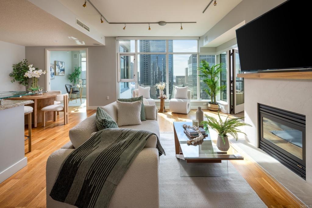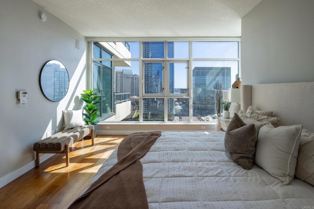 Panoramic bay & skyline views are the centerpiece of this luxury condo at the iconic Grande South. The open-concept design showcases expansive windows in every room that fill the space with natural light and frame sweeping views of the harbor and downtown. The custom kitchen is appointed with granite countertops, stainless appliances, wine fridge, and counter seating that flows seamlessly into the living and dining area. Step outside onto your private balcony, perfectly positioned to take in sunsets over the water. The primary bedroom with ensuite bath has a dual vanity, soaking tub, and walk-in shower. An optional third bedroom offers the flexibility to create an incredible home office or creative space, where you can work while soaking in views of the bay and city lights. Resort-style amenities provide an 80' pool, hot tub, steam room, sauna, recently remodeled gym, on-site concierge, 24/7 security, BBQ area, guest suite, and secured bicycle storage. Two side-by-side underground parking spaces, an additional motorcycle space, and a locked storage area are also included. With a Walk Score of 95, this home is surrounded by the best of downtown. Little Italy, the Marina District, Waterfront Park, Seaport Village, and the Embarcadero, are all within walking distance, while the Gaslamp Quarter, the Rady Shell, and Petco Park are a quick trolley ride away. This is the epitome of Downtown San Diego living, offering endless options for dining, shopping, and entertainment.