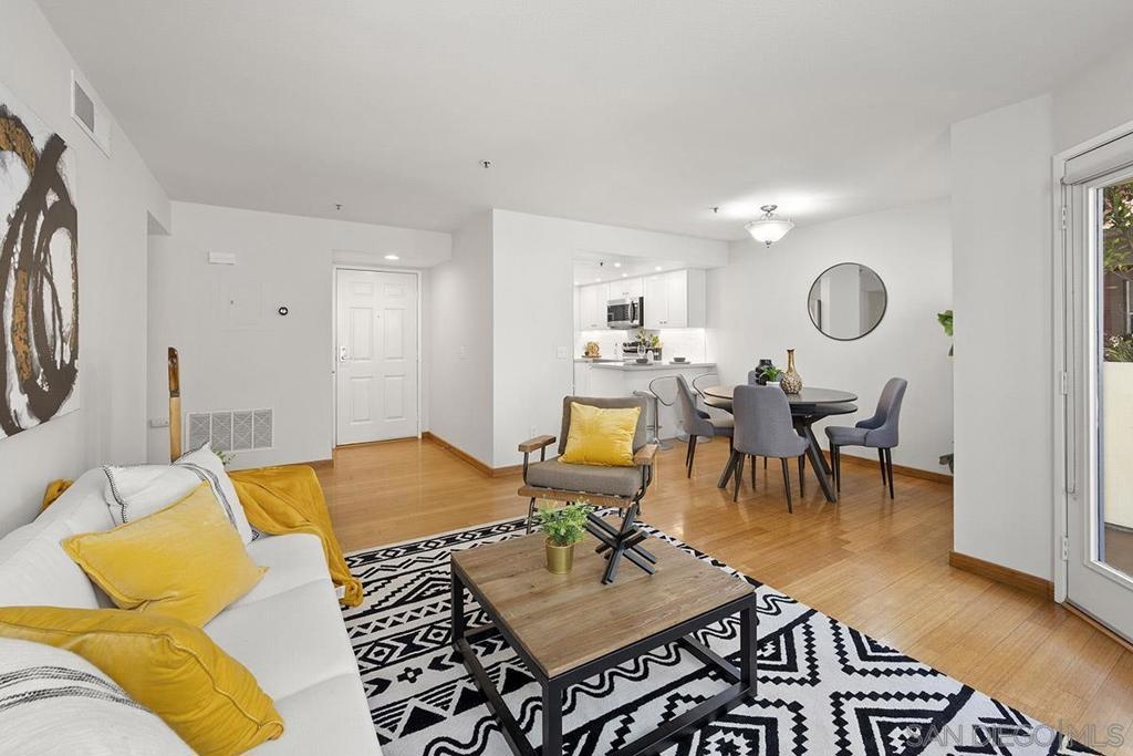 PRIME HILLCREST LOCATION: Do not miss this ground-level Uptown District residence that is merely steps away from EVERYTHING! This peaceful interior and impeccably maintained unit is flooded with natural light and boasts rich hardwood floors and baseboards, cool paint tones, and a private patio overlooking the tranquil rose garden courtyard. The fabulously upgraded kitchen is complete with stainless appliances, quartz surfaces, designer subway tile backsplash, farmhouse sink, recessed lighting, and ample cabinetry. Both dining and entertaining are a breeze with an adjacent dining space and convenient breakfast bar. PLUS two spacious bedrooms, two sparkling bathrooms, plenty of closet and storage space, in-unit washer/dryer, elevator access, and TWO secured parking spaces. A turnkey Uptown charmer fit for the discerning metropolitan dweller! Uptown District is a desirable gated community situated in the heart of bustling Hillcrest. Take advantage of being within walking distance of some of the city’s best restaurants, cafes, boutiques, grocery stores, beloved Hillcrest Farmers Market, and the world-famous Balboa Park. Residents enjoy the pool and spa, fully equipped fitness center, outdoor BBQ grilling area, dog park, and impeccably maintained landscaping. Complex Features: ,,, Equipment: Dryer, Range/Oven, Washer Sewer: Sewer Connected Topography: LL