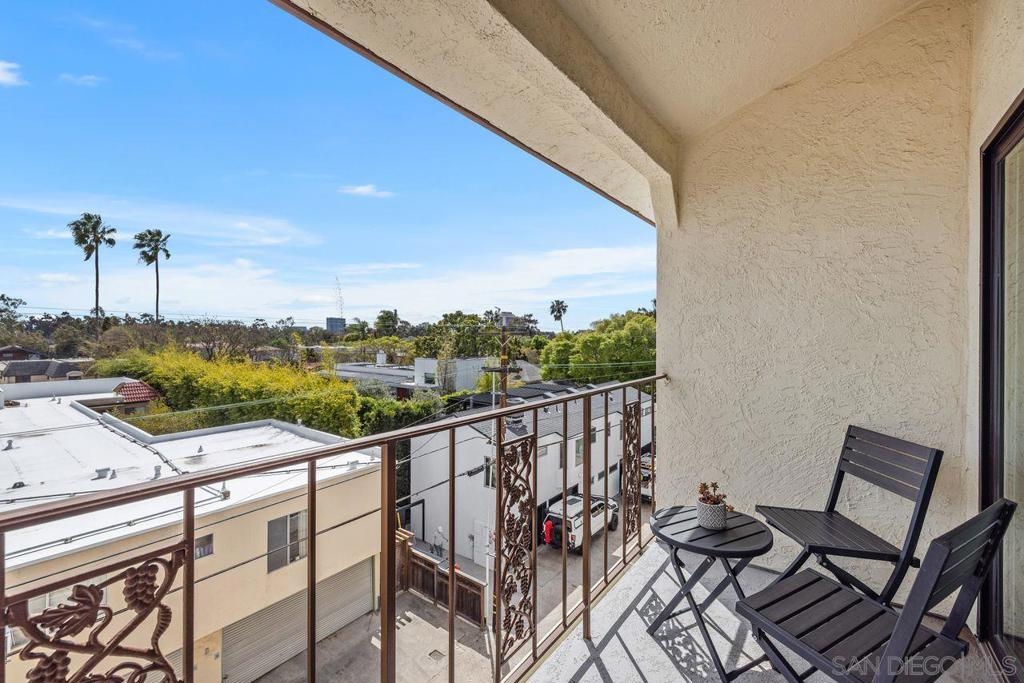 Discover a hidden gem in the heart of Hillcrest within the charming “Burgundy House”, a stunning building featuring a large inner courtyard, elegant stained glass entry, a quaint library, and a complete gym. This top-floor condo offers an abundance of natural light through multiple windows and vaulted ceilings, creating an open and airy living space. The unit boasts two bedrooms, each with picturesque Romeo and Juliet balconies, and a spacious living room anchored by a cozy fireplace. The recently updated eat-in kitchen is a highlight, showcasing IKEA light wood cabinets, a farmhouse-style sink, and a south facing slider that fills the space with sunshine. Practical touches include newer neutral carpeting, a larger balcony with convenient storage, and an upgraded bathroom featuring a new vanity and elegant granite countertop. In-unit stackable washer and dryer add to the convenience. Located just blocks from San Diego’s original and largest Farmers’ Market, this property offers unbeatable access to Trader Joe’s, Whole Foods, local restaurants, and all the vibrant amenities Hillcrest has to offer, with super easy freeway access making commuting a breeze. In addition to the beautiful stained glass front doors and charming inner courtyard, Burgundy House offers a complete gym with treadmill, stair stepper, stationary bike, and weight rack. No need to join a gym! It also offers a cozy library for studying, meetings, work on a laptop, whatever - an extension of your home space! In addition to the beautiful stained glass front doors and charming inner courtyard, building offers a complete gym with treadmill, stair stepper, stationary bike, and weight rack. No need to join a gym! It also offers a cozy library for studying, meetings, work on a laptop, whatever - an extension of your home space!
