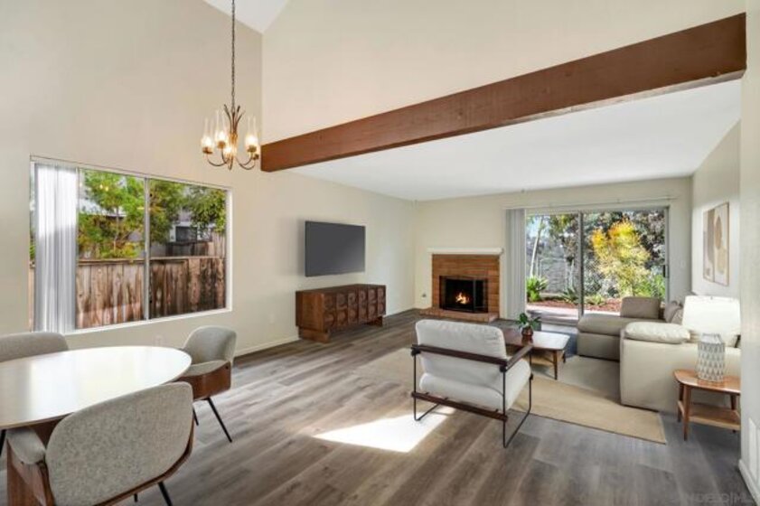Set within the established Bay Ridge community, this residence offers a sense of calm and separation that’s increasingly hard to find, while still remaining truly central to everything San Diego has to offer. Mature trees, well-kept greenbelts, and a quiet residential setting create a neighborhood feel that stands apart from the surrounding city. Inside, the home is defined by volume, light, and flow. Vaulted ceilings elevate the living spaces, giving the interior an open, breathable quality that feels both comfortable and intentional. Updated flooring runs throughout, complemented by new carpet that adds warmth to the private living areas and reinforces the home’s fresh, clean aesthetic. The layout encourages connection without sacrificing flexibility, allowing the home to adapt effortlessly to different stages of life. The kitchen is thoughtfully positioned and filled with natural light, featuring updated finishes that complement both form and function. A pass-through shelf creates an easy connection to the main living space, making it ideal for entertaining or casual everyday use. The bathrooms have been updated with clean, modern touches. The main living areas remain open, bright, and inviting, anchored by a fireplace that adds warmth and character. Natural light pours in throughout the day, and the transition to the outdoor space offers a private escape framed by greenery and hillside views, ideal for quiet mornings or relaxed evenings. One of the home’s most practical advantages is its bedroom and full bathroom on the first floor, offering flexibility. Upstairs, each bedroom features its own en-suite bathroom, providing privacy and comfort, while the generously sized primary bedroom with walk-in closet stands out as a true retreat. What truly sets this home apart is how livable it feels. Every space feels cared for, current, and move-in ready. The design supports privacy when needed and openness when desired, striking a balance that’s hard to replicate. Combined with a well-maintained community featuring a pool, park, and winding walkways, Bay Ridge offers a lifestyle rooted in ease, stability, and long-term value. A rare opportunity to own something that feels grounded, peaceful, and genuinely livable