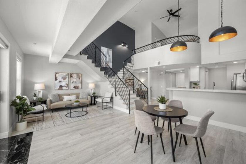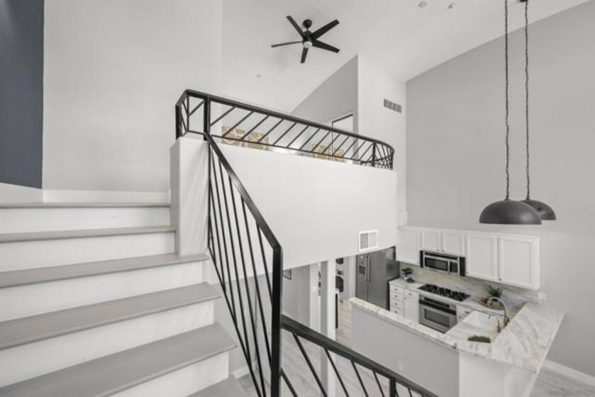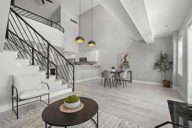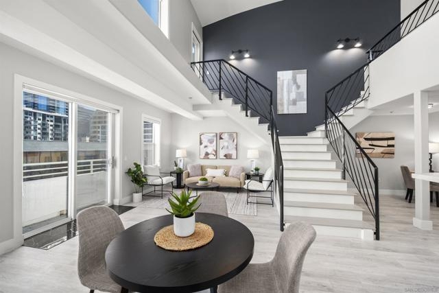 PRICE IMPROVEMENT! TOP-FLOOR, CORNER UNIT, 2-STORY LOFT w/SPLIT GRAND STAIRCASE! Immerse yourself in the lively culture of LITTLE ITALY with its renowned restaurants, bars, and cafes like Born & Raised, Craft & Commerce, and the vibrant Piazza Della Famiglia. Enjoy proximity to the San Diego Bay, Waterfront Park, and the Farmer's Market, all within 3 blocks! This one-of-a-kind unit offers 1,055 square feet of modern living with an open loft-style bedroom and 2 full bathrooms. As you step inside, you'll be greeted by towering 20-foot ceilings and brand new luxury vinyl flooring. This fully remodeled kitchen features elegant marble counters with a wraparound bar, perfect for hosting and entertaining. Enjoy the convenience of an In-Unit Full Size Washer/Dryer, and unwind on one of the two oversized private balconies. This loft-style penthouse is thoughtfully designed with a double staircase adorned with custom wrought iron railings, providing an artistic touch to the space. The upstairs area offers a full bath, loft style bedroom, Walk-In Closet, Balcony, and automatic blinds. Downstairs offers 1 full bath and a flex-space to be used as an optional bedroom, den, or office. 1 assigned, oversized, underground parking spot, that includes storage and additional space options (see pics). Village Walk amenities include a beautiful common courtyard with a waterfall, large fitness center, and a community rec room for social gatherings. This top-floor gem offers the ultimate blend of comfort, luxury, and urban convenience. Make it yours today!