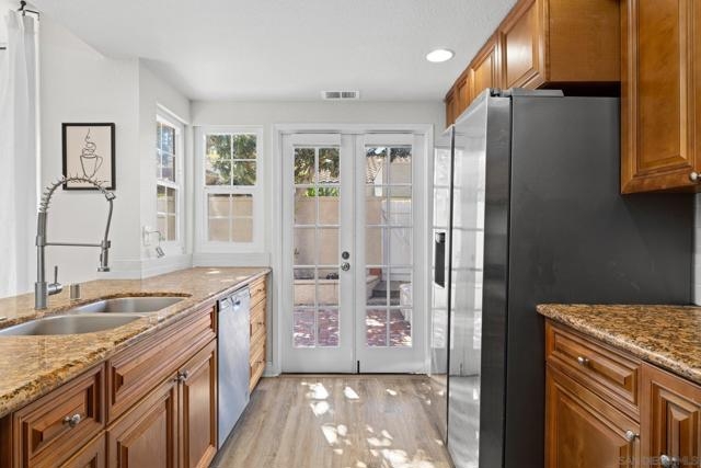 Presenting a Turnkey, 2-story townhome in Las Brisas - located in Rancho Bernardo within the desirable Poway School District! This 3 bed/2.5 bath home offers a main-floor primary suite, a third bedroom upstairs with ensuite bath, new appliances, recessed lighting, a new water pressure regulator, and a new roof (Feb 2025). Enjoy a one-car garage plus additional unassigned parking directly in the front. The private, low-maintenance backyard is perfect for relaxing or entertaining and the inside is surrounded by abundant natural light. Residents enjoy resort-style amenities with access into BERNARDO HEIGHTS REC CLUBHOUSE featuring two pools, hot tubs, tennis courts, pickleball courts, and more — all included in your $650/month TOTAL HOA fees. Residents also enjoy included access into BERNARDO HEIGHTS COMMUNITY CENTER and LUCIDO PARK.