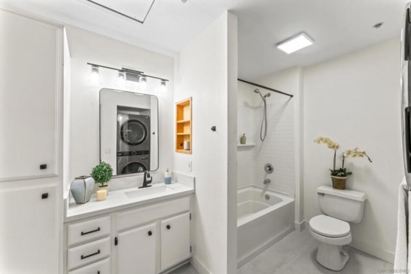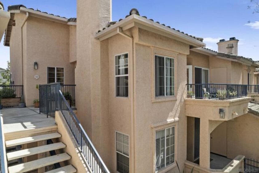 Stunning , sunny premier location, upper-level home welcomes you the moment you step through the door! Nestled in the highly sought-after gated community of Vista Del Lago, this beautifully/recently upgraded and meticulously maintained unit lives bigger than its size with the airy, vaulted ceilings and open space views! Dark Bamboo wood floors flow through the living room, dining area, hallway, & primary bedroom, complementing the custom-designed kitchen featuring new modern flooring and quartz counters, stainless steel sink and appliances. Unique to this unit is the large entry closet and additionally, a pull-down attic offers even more space for storing larger items. Primary walk-in closet has also been extended. Take in lush views from the private balcony. Assigned covered carport is directly in front. This home is a true gem! Schedule a tour today before someone else gets this beautiful move in ready home! Complex now approved for Fanny Mae and conventional lending. Come check out the Bernardo Vista Del Lago resort lifestyle complete with 2 community hot tubs, 3 pools (including 25-meter exercise lap pool), fully equipped exercise gym, pickleball, tennis, recreation room, duck pond and scenic hiking and biking trails. When you're done enjoying all of the community amenities, . Plenty of guest parking spots , as well as EV charging stations for convenience.