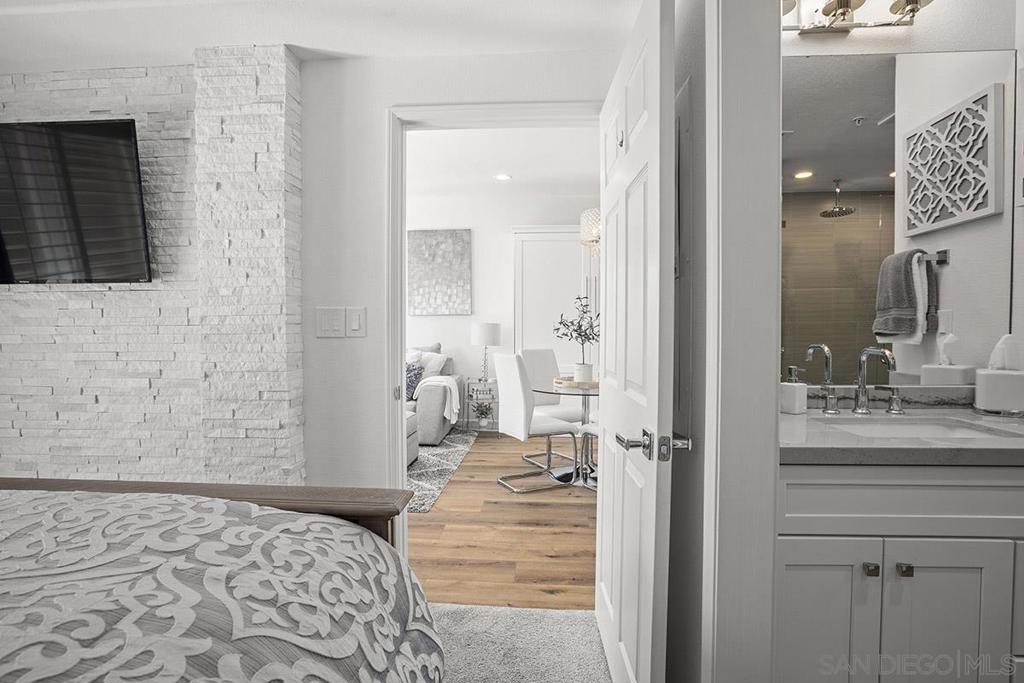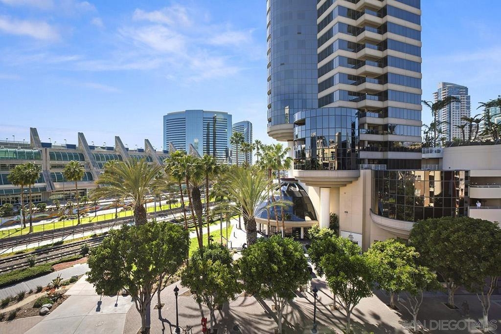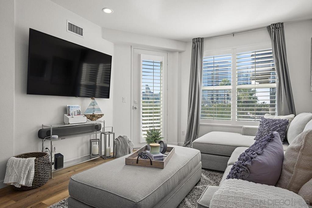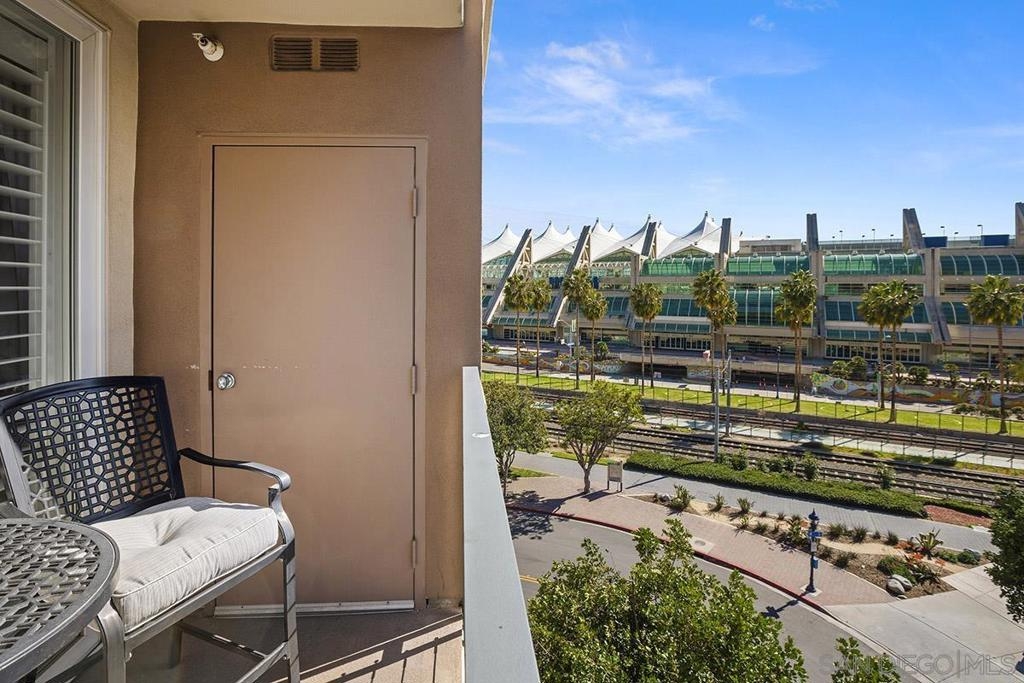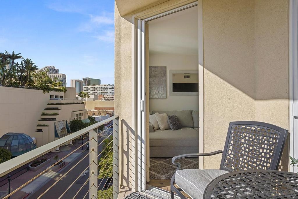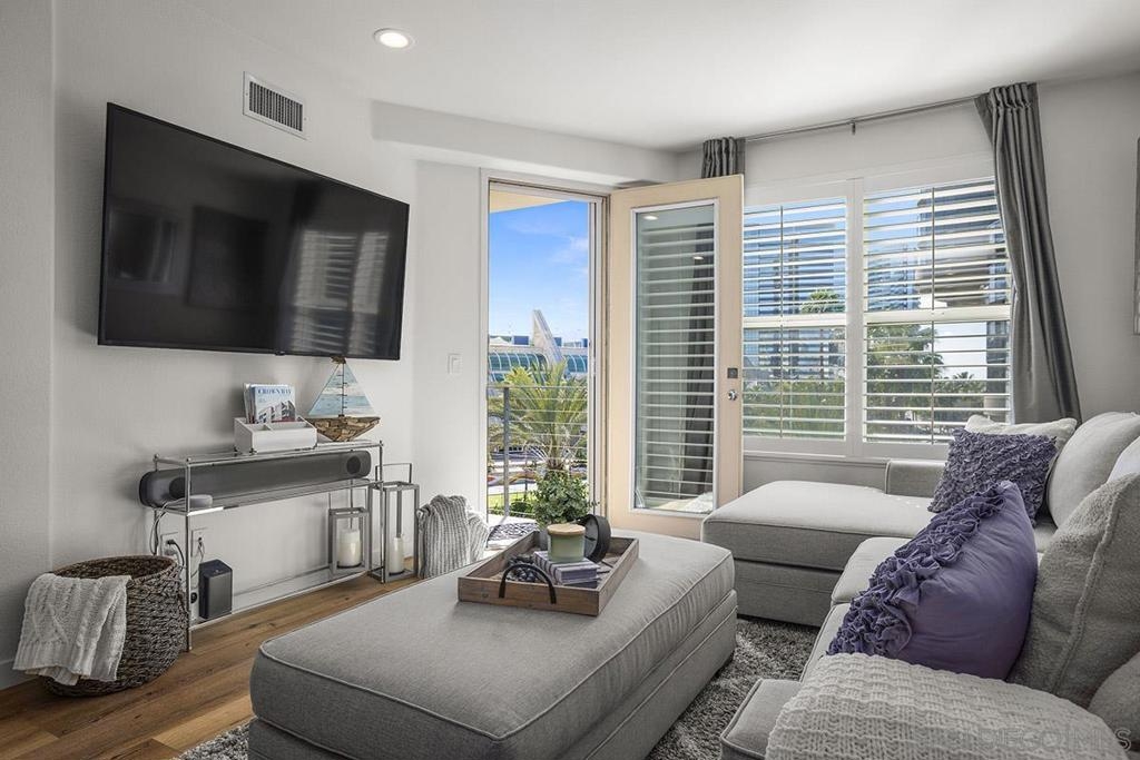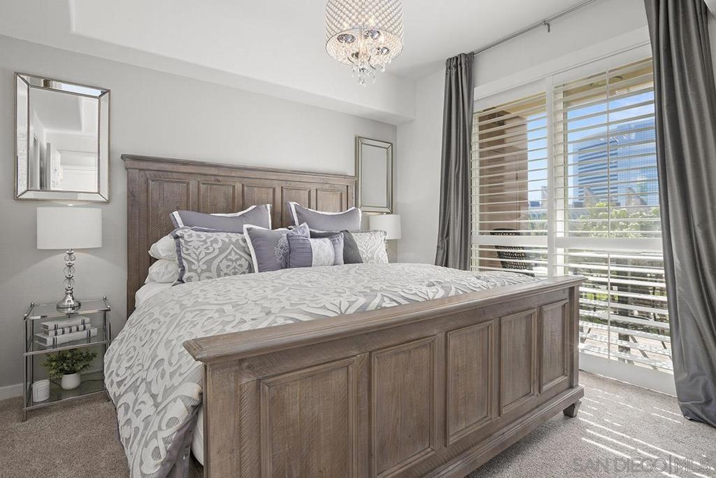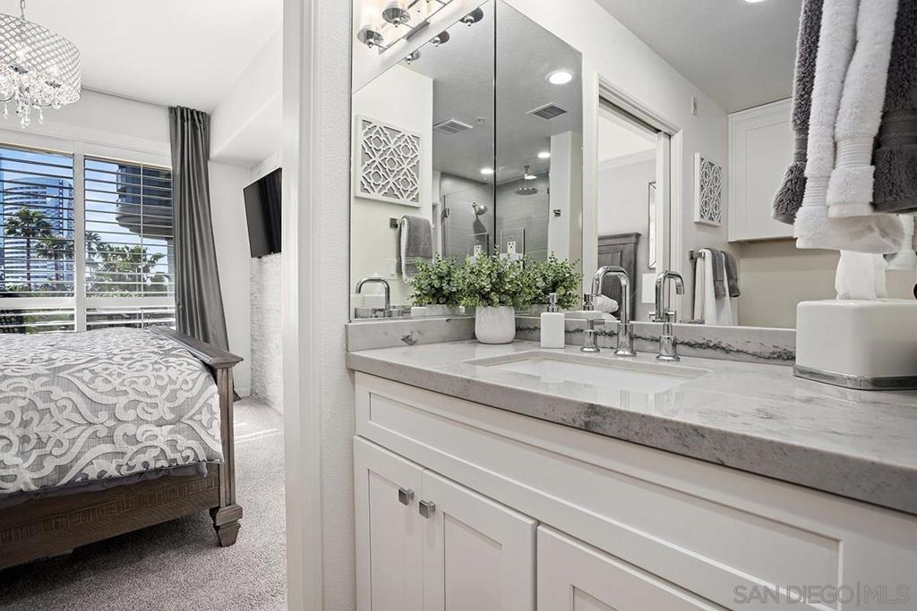 Welcome to your own private sanctuary in the heart of the coverted Marina District with this stunning west-facing Crown Bay residence. Renovated to perfection, this exquisite home is a dreamy Downtown respite. As you step inside, you'll be swept away by the stylish and sophisticated design that exudes elegance and luxury. The open-concept living space is bathed in natural light, with luxury flooring and recessed lighting adding to the ambiance of the space. California shutters provide a touch of privacy, while still allowing you to take in the breathtaking views and the vibrant sunset skies from the secluded balcony. The upgraded open kitchen is a chef's delight, featuring sleek slab marble surfaces, stainless appliances, and a refreshing blue tile backsplash that perfectly complements the pristine white walls. The oversized center island illuminated by pendant lighting is the perfect spot to gather with loved ones and entertain. The bedroom is the ultimate retreat, boasting a unique custom textured accent wall, a spacious walk-in closet, and a completely renovated ensuite bathroom with a frameless step-in rain shower with a French drain. The ample built-in cabinetry for toiletries and linens alike ensures that everything is within easy reach. For even more flexibility, the living room features a wall-mounted Murphy bed, offering a convenient and comfortable sleeping area for guests. When not in use, the Murphy bed can be stowed away, freeing up even more space for entertaining or relaxation. Additional highlights of this turnkey home include a secluded balcony that offers views of the lively Marina District below, plenty of storage including a balcony closet, and a secured parking space. Don't miss your chance to experience this exquisite home for yourself! Located in the esteemed Marina District, Crown Bay is known for its impressive entrance lobby, pleasant courtyards, 5th floor grilling area with a city view to boot and a well-equipped fitness center. Walk across the MLK Promenade to the Convention Center or Seaport Village or take a stroll to the lively Gaslamp Quarter for a multitude of dining and entertainment options. Fully secured, this wonderful location offers prime walkability to all of Downtown’s restaurants and clubs, Petco Park, Horton Plaza, grocery stores, and beautiful San Diego Harbor!
