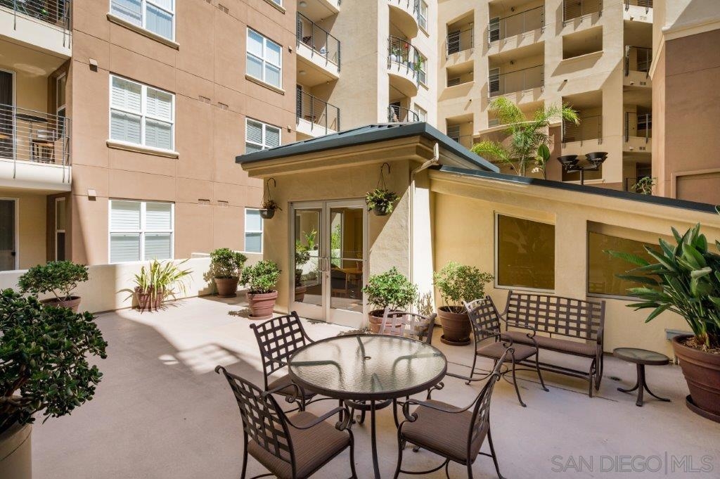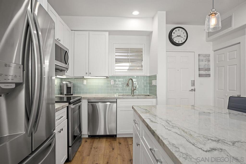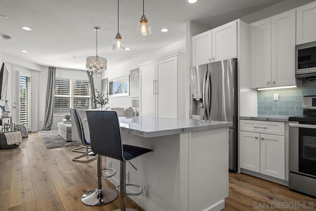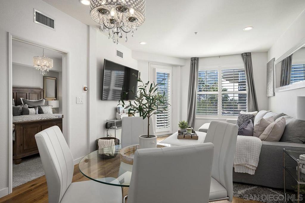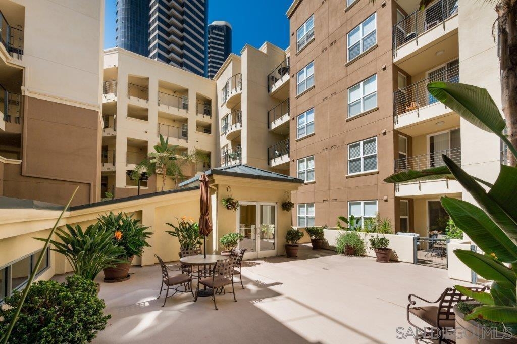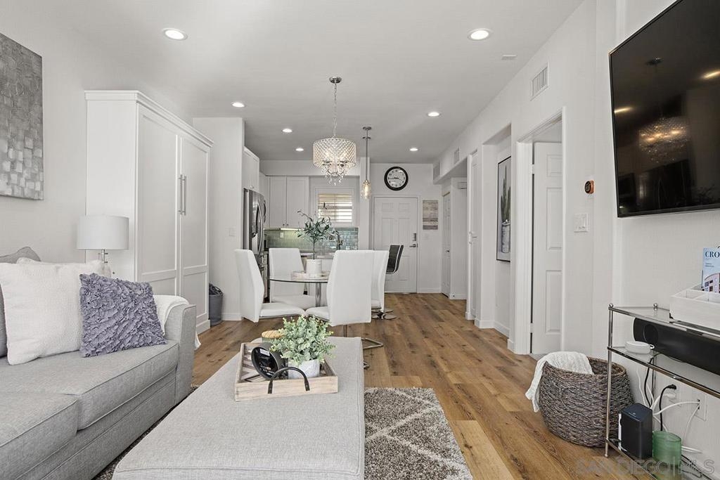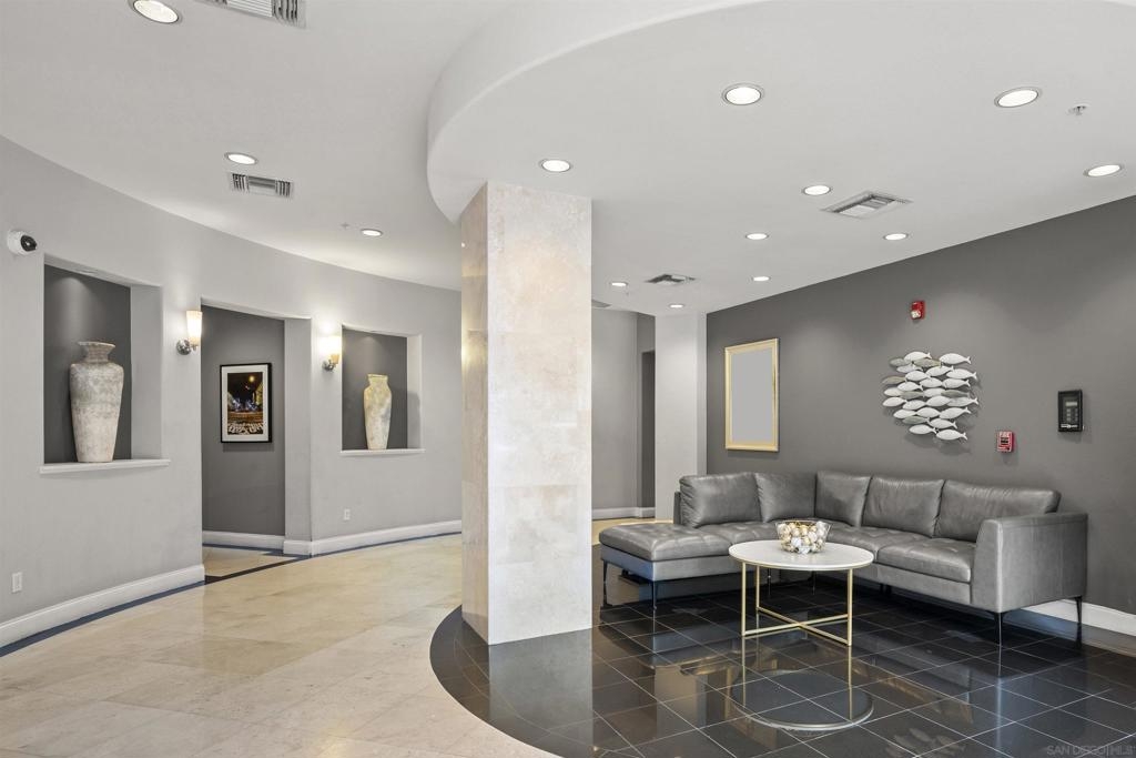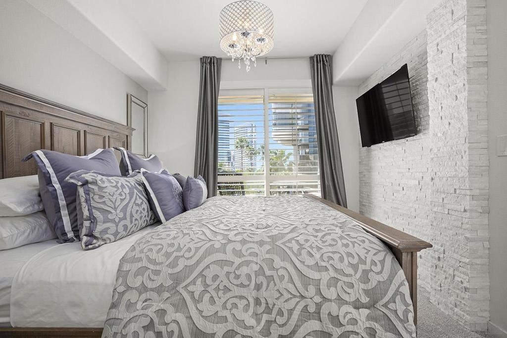 Welcome to your own private sanctuary in the heart of the coverted Marina District with this stunning west-facing Crown Bay residence. Renovated to perfection, this exquisite home is a dreamy Downtown respite. As you step inside, you'll be swept away by the stylish and sophisticated design that exudes elegance and luxury. The open-concept living space is bathed in natural light, with luxury flooring and recessed lighting adding to the ambiance of the space. California shutters provide a touch of privacy, while still allowing you to take in the breathtaking views and the vibrant sunset skies from the secluded balcony. The upgraded open kitchen is a chef's delight, featuring sleek slab marble surfaces, stainless appliances, and a refreshing blue tile backsplash that perfectly complements the pristine white walls. The oversized center island illuminated by pendant lighting is the perfect spot to gather with loved ones and entertain. The bedroom is the ultimate retreat, boasting a unique custom textured accent wall, a spacious walk-in closet, and a completely renovated ensuite bathroom with a frameless step-in rain shower with a French drain. The ample built-in cabinetry for toiletries and linens alike ensures that everything is within easy reach. For even more flexibility, the living room features a wall-mounted Murphy bed, offering a convenient and comfortable sleeping area for guests. When not in use, the Murphy bed can be stowed away, freeing up even more space for entertaining or relaxation. Additional highlights of this turnkey home include a secluded balcony that offers views of the lively Marina District below, plenty of storage including a balcony closet, and a secured parking space. Don't miss your chance to experience this exquisite home for yourself! Located in the esteemed Marina District, Crown Bay is known for its impressive entrance lobby, pleasant courtyards, 5th floor grilling area with a city view to boot and a well-equipped fitness center. Walk across the MLK Promenade to the Convention Center or Seaport Village or take a stroll to the lively Gaslamp Quarter for a multitude of dining and entertainment options. Fully secured, this wonderful location offers prime walkability to all of Downtown’s restaurants and clubs, Petco Park, Horton Plaza, grocery stores, and beautiful San Diego Harbor!