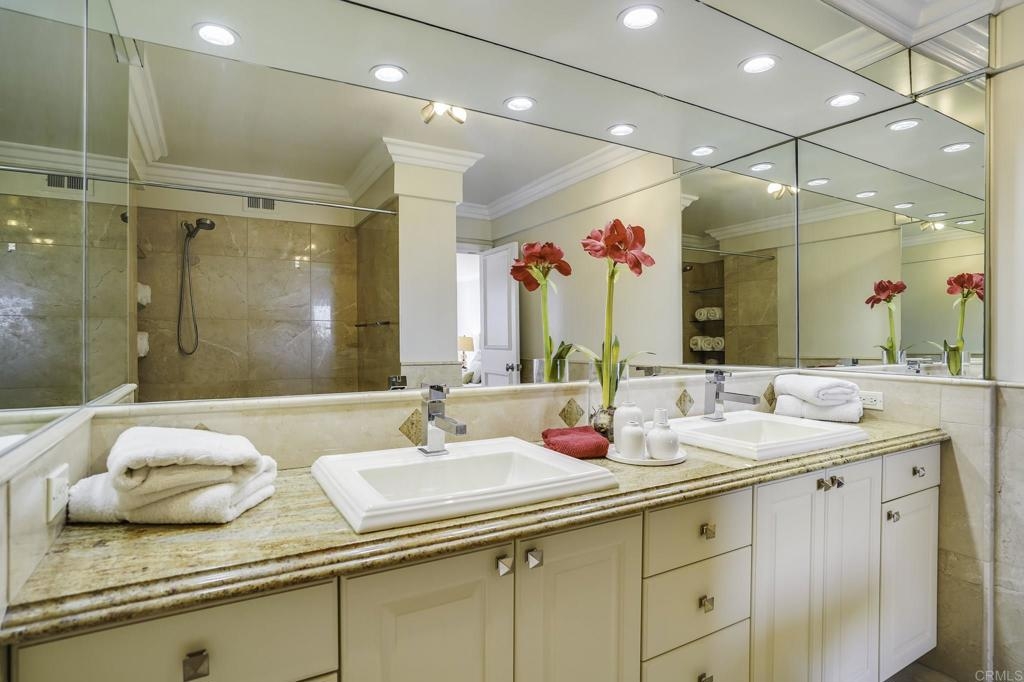 Float above downtown in your personal heaven! Come visit this exquisite 2-bedroom, 2-bath condo with sweeping views of the bay, the cityscape, and the ocean from every! Completely remodeled with elegant touches of travertine tile, crown molding, chair rails, built-in library shelve in the living room. The best asset of this home is the airy natural light that floods through the floor to ceiling windows from every room in the condo! This home has ample room for entertainment and leisure with a 30’x10’ balcony extending from the casual and formal dining rooms. In the kitchen, there are top-of-the-line Stanley Steel appliances, granite counter tops, and updated cabinets. Lastly, there are two covered parking spots in a gated garage with easy, direct access to the elevator. An added bonus is the Penthouse Clubhouse Terrace. This huge terrace has 360-degree views of San Diego, you can even see as far as La Jolla! Featuring a pool table, a bar, a cute seating area, a fireplace and a beautiful stone water fountain, this penthouse terrace is perfect for private parties, barbequing, and an added bonus of luxury living in the heart of Downtown San Diego.
