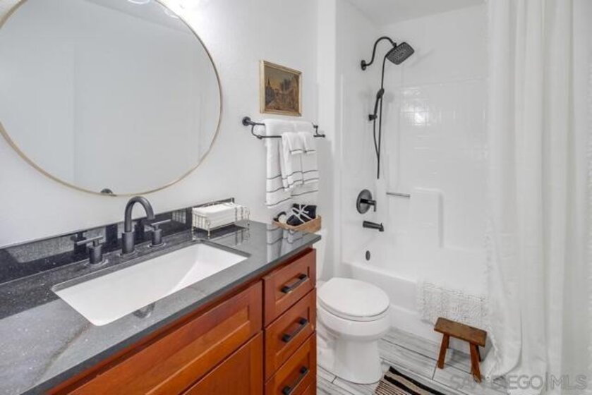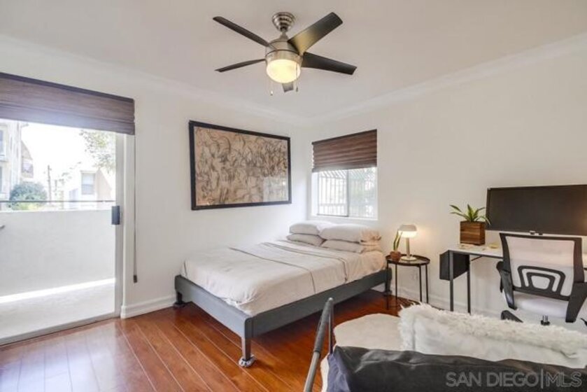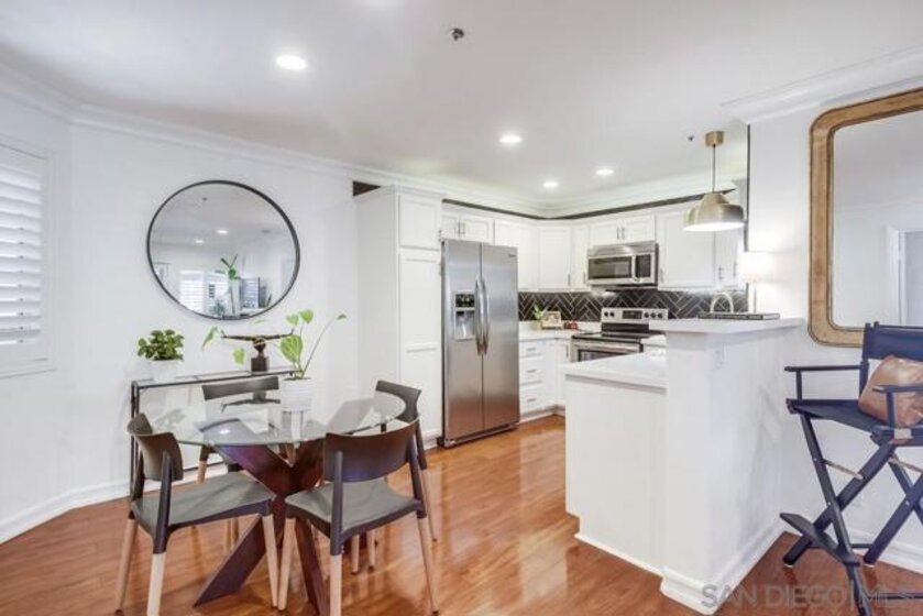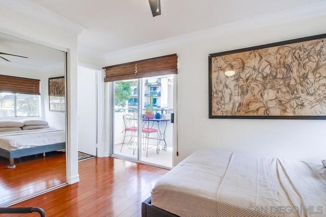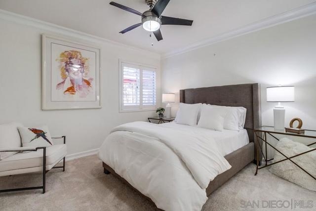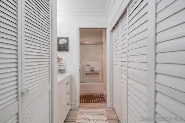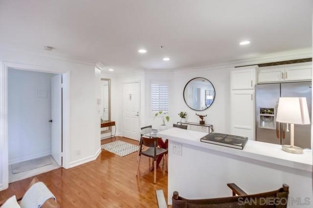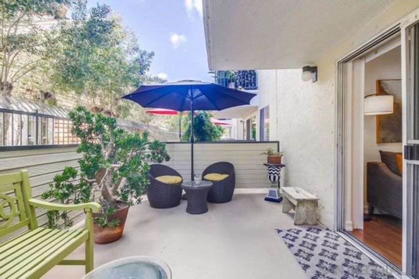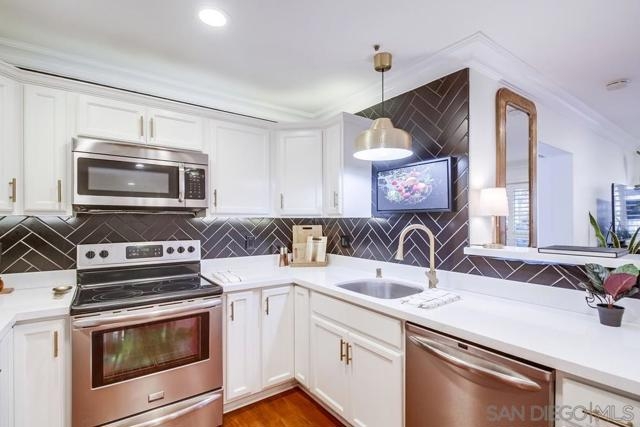 Step into this exquisite turn-key 2-bedroom, 2-bathroom corner unit, meticulously designed to perfection! Discover crown molding gracing every corner, bespoke shutters adding charm, and stunning flooring enhancing the ambiance. The expansive open kitchen boasts custom cabinets and modern appliances, making it a culinary dream. With a split master layout, each master suite presents spacious bathrooms and ample closet space for your convenience.Enjoy not one but two outdoor areas; the main patio alone spans nearly 200 sqft, ideal for relishing our enviable weather. Your laundry room is conveniently located just outside the unit, adding to the ease of living. Parking is a breeze with two assigned garage spaces and two additional storage units, ensuring you have ample space for all your belongings. This property offers everything you need to thrive and embrace the vibrant lifestyle that Hillcrest has to offer.