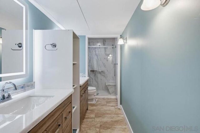 Move-in ready and beautifully remodeled Sea Colony Plan 4 (Shearwater) condo in the heart of Point Loma. Located in the original model-home row of the community, this home enjoys an unusually open feel with the widest sidewalk frontage in the complex and greater privacy from neighbors. The home has been extensively upgraded in 2023–2024 with thoughtful, high-quality finishes throughout. Nearly every surface has been refreshed, including Travertine-style tile flooring throughout, new lighting, recessed lights, ceiling fans, doors, and fixtures. The remodeled kitchen features new appliances, countertops, backsplash, sink, and cabinetry updates. All three bathrooms have been fully renovated with modern fixtures and easy-clean showers with lifetime warranties.Additional upgrades include quad-pane Quiet Home Program windows and doors, new Juliette door, Dream-style bay window, upgraded electrical panel, new plumbing connections, water filtration system, and a new water heater. Vaulted ceilings, abundant natural light, and two private patios create a bright coastal atmosphere throughout the home. Enjoy the convenience of a spacious two-car garage with storage and in-unit laundry. The Sea Colony community offers resort-style amenities including pool, spa, tennis & pickleball courts, basketball courts, playground, clubhouse, and picnic areas. Ideally located next to shopping, restaurants, Point Loma Library, and schools, and just 1.5 miles to Ocean Beach Dog Beach with easy access to the airport and downtown. Quiet location away from the community center with peaceful surroundings.