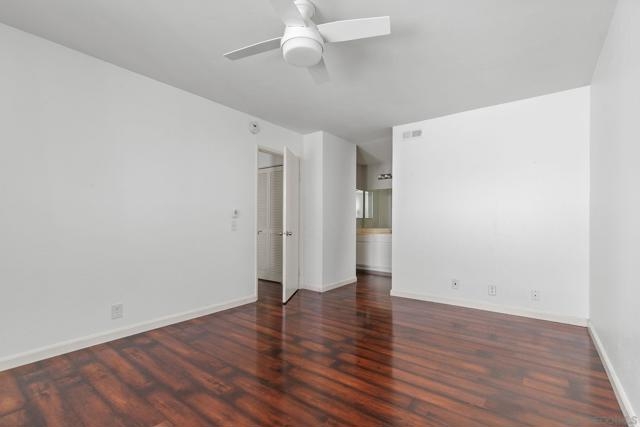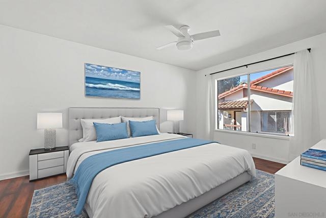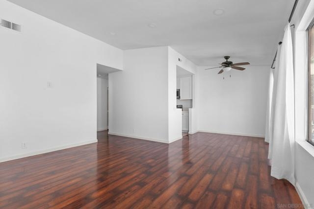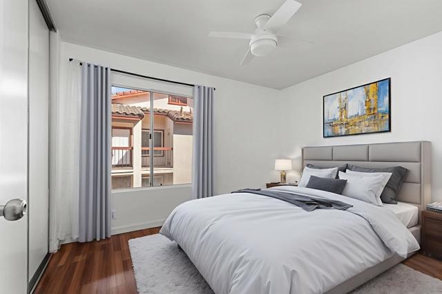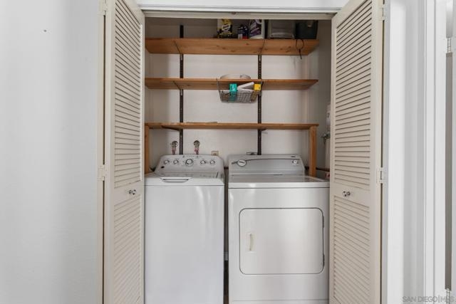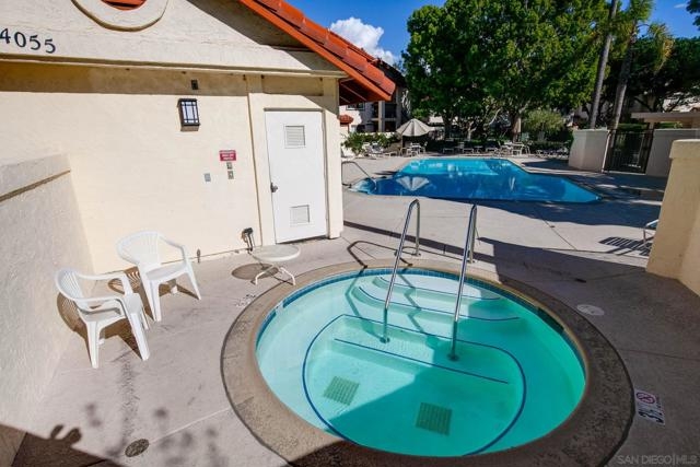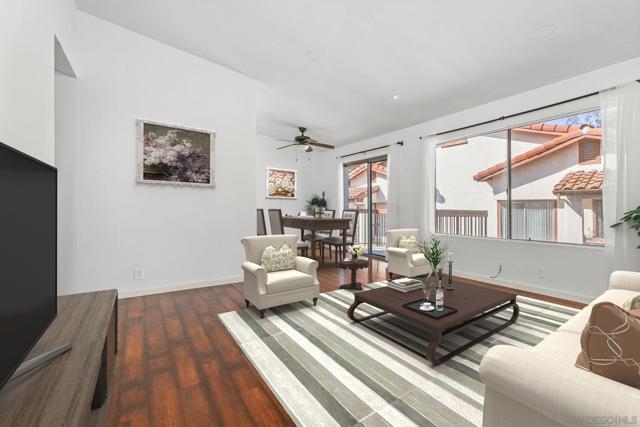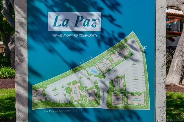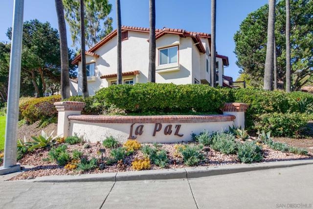 Top floor, corner unit in the beautiful La Paz subdivision of La Jolla Colony. This condo features 2 bedrooms, 2 full bathrooms, newer flooring, recessed lighting, and a renovated kitchen with newer appliances. The unit is set in the middle of the complex, off of the street to provide a quiet location. Open living space with vaulted ceilings and plenty of large windows for natural light. Newly rebuilt deck is accessible off of the living room. Kitchen features plenty of cabinets, refrigerator, microwave, dishwasher, and stainless steel sink. Secondary bedroom with full bathroom just outside - newer shower tiled walls, sliding shower door, and shower fixtures. In unit washer and dryer - side by side with extra storage in the closet. Generous sized primary bedroom with large walk-in closet. Upgraded master bathroom shower with whole wall tiles and fixtures. HOA dues include water, sewer, trash, building insurance, common area maintenance, roof, exterior building maintenance, and off-site property management. Two assigned carport parking spots! Community amenities feature a heated swimming pool and hot tub. The La Jolla Colony master planned community is minutes from UCSD, La Jolla beaches, the trolley, and 3 shopping centers with an abundance of restaurants, grocery stores, and services. The large, private park in La Jolla Colony is perfect for walking, exercising, and enjoying the serene outdoors. A prime location indeed! *Some photos are virtually staged*