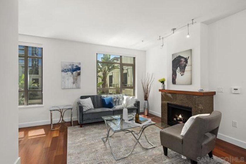 Experience exceptional value at Electra in this incredibly rare 5th-floor townhouse in one of Downtown San Diego’s most iconic residential towers. Enjoy approximately 600 sq.ft. of private outdoor space, including a 500 sq.ft. rooftop terrace and a charming 100 sq.ft. front patio. The open living area showcases city views, ambient fireplace, and overlooks “Electra Park”. The kitchen is filled with natural light from a skylight and is outfitted with Thermador, Bosch, and Samsung stainless appliances. Luxurious resident amenities include a pool, spa, sauna, steam room, fitness center, the stunning Conservatory, 24-hour front desk, and more. Just steps to Little Italy, the Gaslamp, Union Station for easy trolley, Coaster, and train access, bayfront parks, and world-class dining: upscale urban living at a remarkable price! Offering a fabulous location in the coveted Columbia District, you will love being only a short walk to Waterfront Park, Seaport Village, The Headquarters, and the brand-new Rady’s Shell at Jacobs Park, a unique live music venue and home of the San Diego Symphony! Also enjoy proximity to the future life science and biotechnology research development The Research and Development District (The RaDD) at the Embarcadero and the sustainable tech-focused Horton Plaza Redevelopment in the center of the city. Electra has the unique distinction of being built around the historical 1928 SDG&E Station B. Residents can take advantage of an array of services including a concierge, top notch security, and guest parking spaces available by reservation through a simple mobile app. Luxuriate in a steam room, resort-style pool and spa, fitness center, and Electra Park on the 5th floor where you may seek respite from the hustle and bustle surrounded by lush landscaping and a romantic outdoor fireplace and top-of-the-line barbecues.Old MLS listings quoted builder brochure 1295 sq.ft., tax assessor’s record shows 1097 sq.ft.
