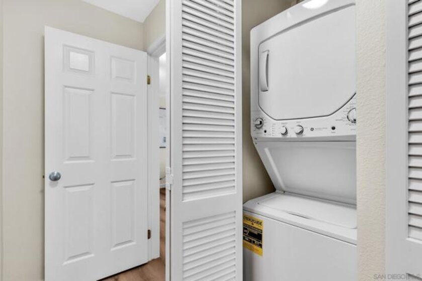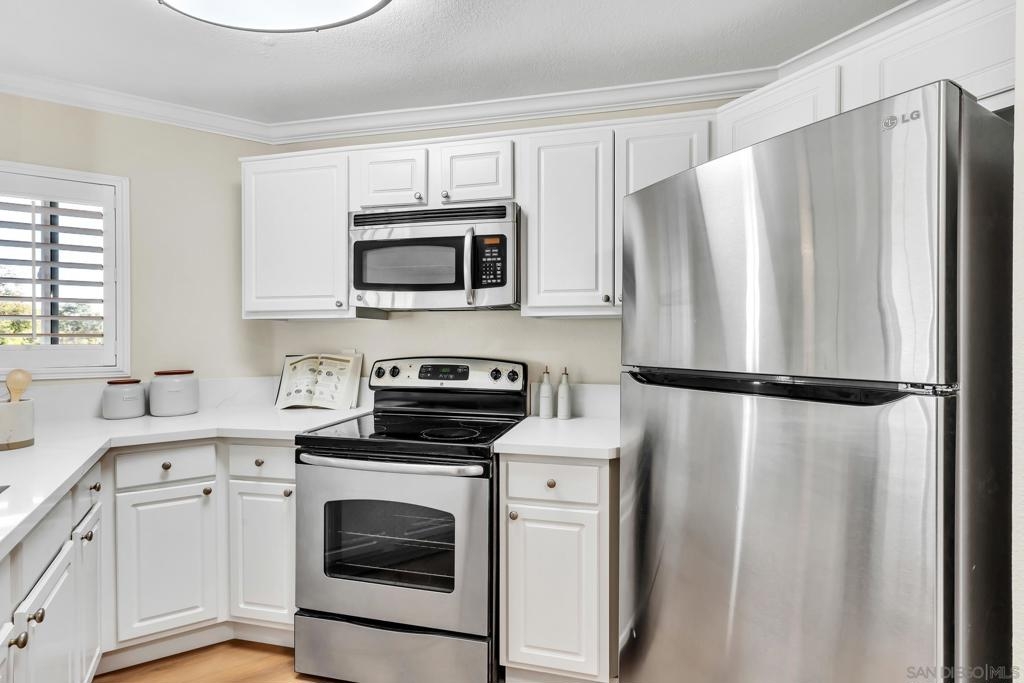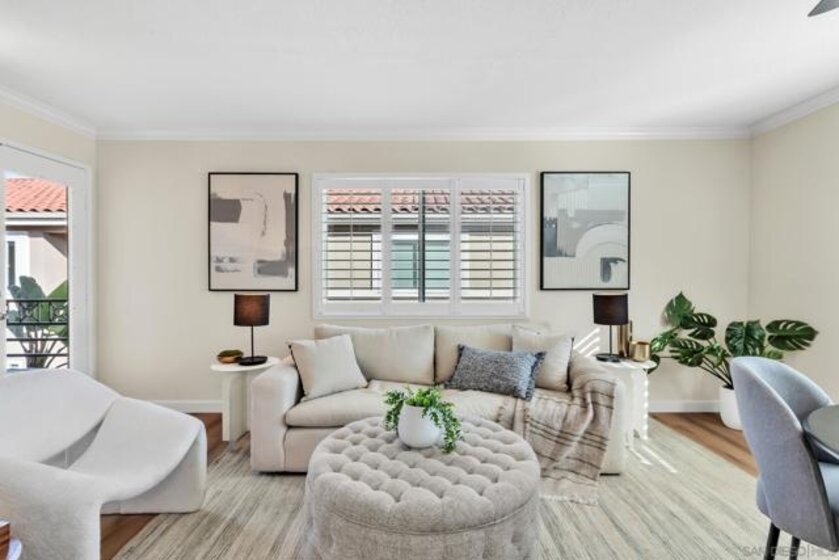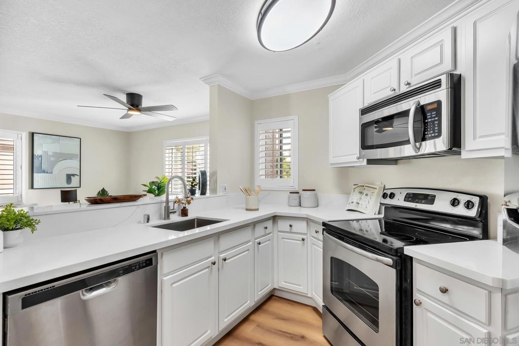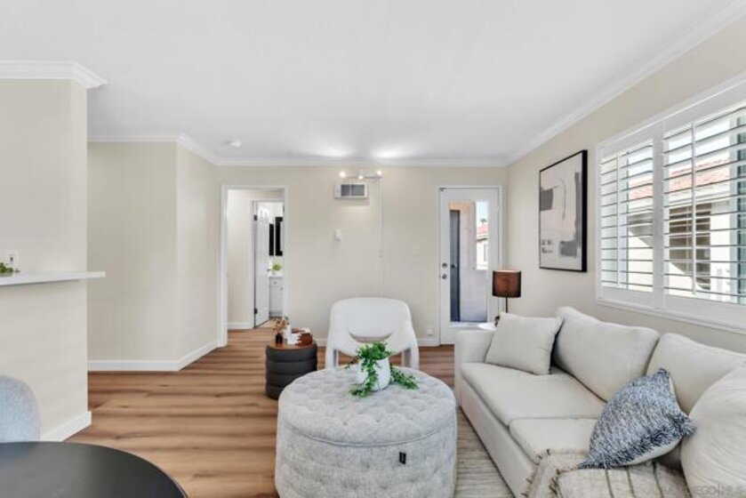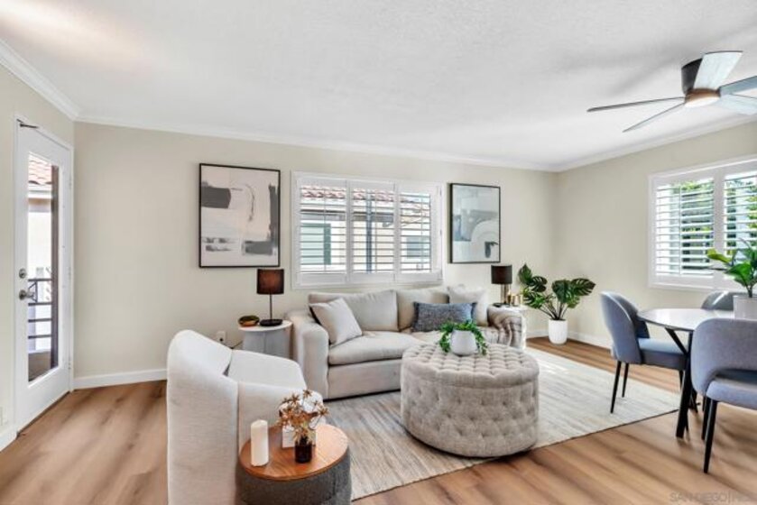 Welcome to this beautifully upgraded 1-bedroom, 1-bath upper corner unit in the desirable Verano community of University City, featuring a prime location within the complex. This light-filled home has been thoughtfully refreshed throughout with new flooring, including luxury vinyl plank flooring in the living areas for increase durability and high-end, low-pile carpet in the bedroom. The kitchen and bathroom have been tastefully upgraded, complemented by fresh interior paint and new fixtures, making this home truly move-in ready. Enjoy the privacy of an upper-level corner unit ideally situated near the pool, while still offering a peaceful residential feel. Parking is convenient with one garage space plus one permitted parking spot. Verano offers a resort-style lifestyle with multiple pools, a fitness center, and well-maintained common areas. Ideally located just a short walk to La Jolla Colony Park, with close proximity to Doyle Community Park & Rec Center, local shopping + dining, and with easy access to major freeways, this home offers exceptional comfort, convenience, and lifestyle in the heart of University City.